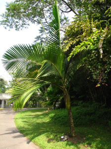 Descripción: palmera excepcionalmente alta y esbelta, con hojas palmeadas y un solo tronco, delgado de unos 20 centímetros de diámetro y puede alcanzar una altura de unos 10 metros, sus hojas son redondas, con forma de abanicos debido a su gran cantidad de pliegues, de color verde y plateada, los frutos son redondos, color verde amarillento y cuando están maduros son color negros, se caracterizan por ser fibrosos y contienen dentro una semilla.